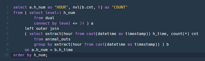 | ( select extract(hour from cast(datetime as timestamp)) h_time, count(*) cnt from animal_outs group by extract(hour from cast(datetime as timestamp)) ) b |