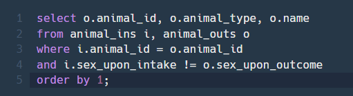 -- sex_upon_intake와 sex_upon_outcome이 같지 않다(!=)라는 조건을 통해 출력할 수 있다