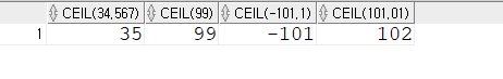 select ceil(34.567), ceil(99), ceil(-101.1), ceil(101.01)