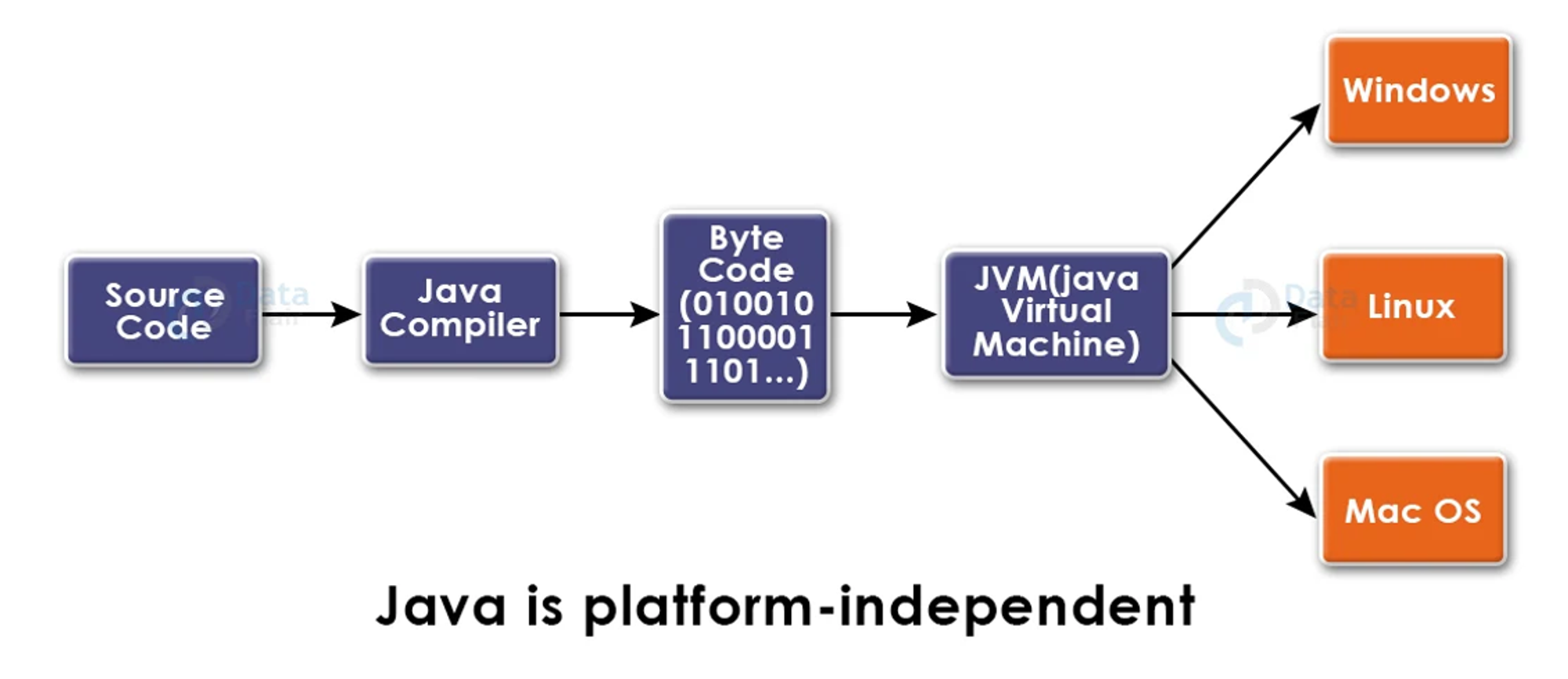 - μλ° μμ€ μ½λλ λ¨Όμ μλ° μ»΄νμΌλ¬μ μν΄ λ°μ΄νΈμ½λλ‘ λ³νλκ³ , μ΄ λ°μ΄νΈμ½λλ μλ° κ°μ λ¨Έμ (JVM)μμ μΈν°νλ¦¬νΈ λμ΄ μ€νλκΈ° λλ¬Έμ΄λ€.